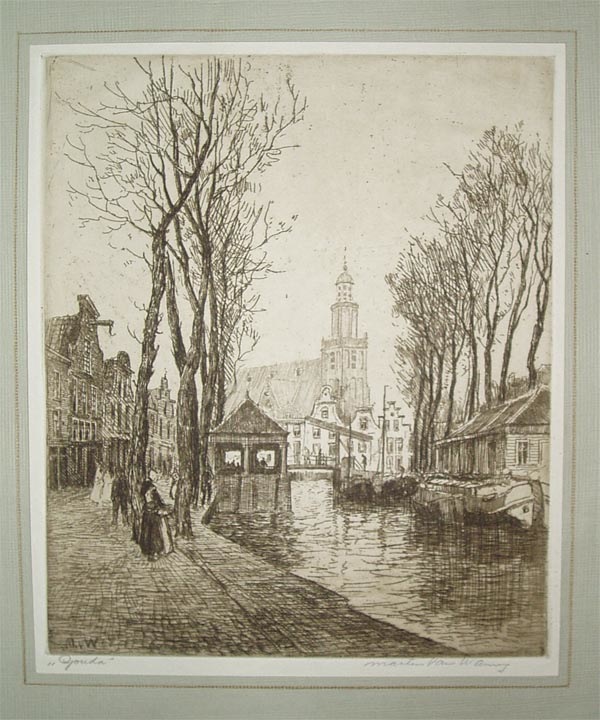 Gouda vischmarkt Martin van Waning 1882-1972 ets 20x24cm. € 75.-