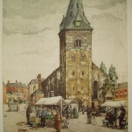 Gouda vischmarkt Martin van Waning 1882-1972 ets 20x24cm. € 75.-